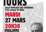Philippe Poutou, candidat du NPA à la présidentielle sera en meeting à Tours, le mardi 27 mars 2012, salle familiale des Fontaines, (8bis avenue de Milan, quartier des Fontaines :http://fr.mappy.com/#d=8bis+avenue+de+Milan+37000+Tours&p=map … Lire la suite