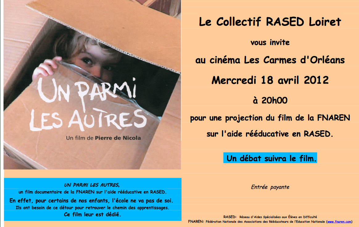 Le collectif RASED 45 -Réseau d’Aides Spécialisées aux Elèves en Difficulté- organise des projections débat du film « Un parmi les autres » :