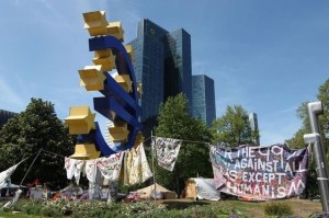 « Affamés ? Mangez un banquier ! », pouvait-on lire sur l’une des banderoles brandies par les manifestants, qui ont exprimé leur colère face aux mesures d’austérité défendues par la BCE, dont le siège se trouve à Francfort.