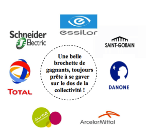 Plusieurs entreprises du CAC 40 réussissent même à ne pas payer d’impôts du tout: Total, Danone, Essilor, Saint-Gobain, Schneider, Suez Environnement, Arcelor Mittal… alors que EDF, GDF-Suez, Renault et France Télécom assurent à elles seules 40% du montant total : quatre entreprises dont l’Etat est actionnaire !