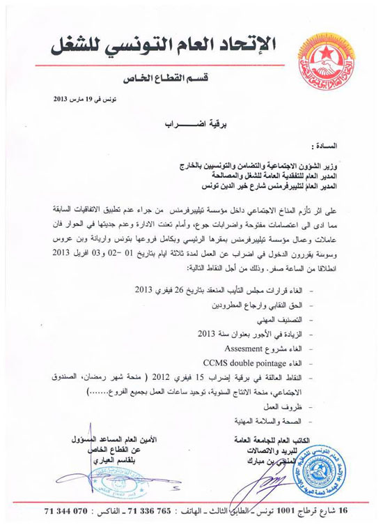 Les revendications des salariés sont : l’ annulation des décisions du conseil de discipline du 26 février 2013, la garantie du droit syndical, le retour des employés révoqués, la classification professionnelle, l’augmentation des salaires de 2013, l’annulation du projet d’assainissement, l’annulation du double pointage, le règlement des points qui subsistent de la missive de la grève du 15 février 2013 ainsi que l’amélioration des conditions de travail, de santé et de sécurité professionnelle.