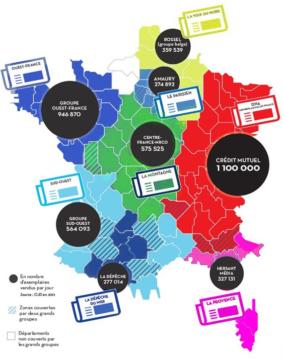 Au Sud et Sud-Ouest, La dépêche et Sud-Ouest (Sud-Ouest et Midi-Libre) règnent en maitre. Pour la région parisienne c’est le groupe Amaury qui fait la loi.
