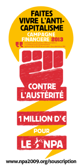 L’argent n’est pas le nerf essentiel de la guerre. L’essentiel, c’est la conscience, l’organisation et la lutte des classes opprimées. Il est cependant indispensable dans cette société mercantile. C’est pourquoi nous lançons une campagne financière et politique, en nous tournant vers toutes celles et ceux qui nous entourent. Cet argent, nous le demandons pour notre combat collectif en général, pour lui donner plus d’efficacité, et en particulier pour nous donner les moyens de nous présenter aux prochaines élections européennes de 2014. Nous soutenir peut être un geste d’adhésion, de soutien, de solidarité ou plus simplement encore une geste de sympathie, un geste démocratique. Mais c’est un geste utile qui comptera.
