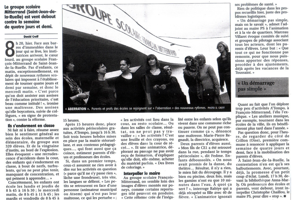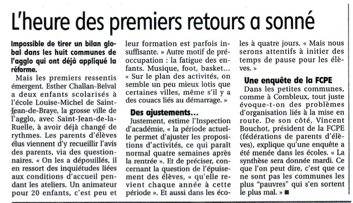 Le 3 octobre à Aubervilliers, deux tiers des écoles étaient fermées, 90% des enseignants du premier degré se sont mis en grève. Les enseignants et leurs syndicats (ils étaient 500 face au maire !) exigent la suspension immédiate des nouveaux rythmes, et ils ne comptent pas s’arrêter là. À Paris, des AG ont été convoquées dans tous les arrondissements ; une AG centrale est appelée par les syndicats (SNUipp, FO, SUD, CNT et CGT) pour le mardi 8 octobre, afin de « dégager les voies et les moyens pour en obtenir [la] suspension » de la réforme. Au sein de la FCPE, la colère monte.