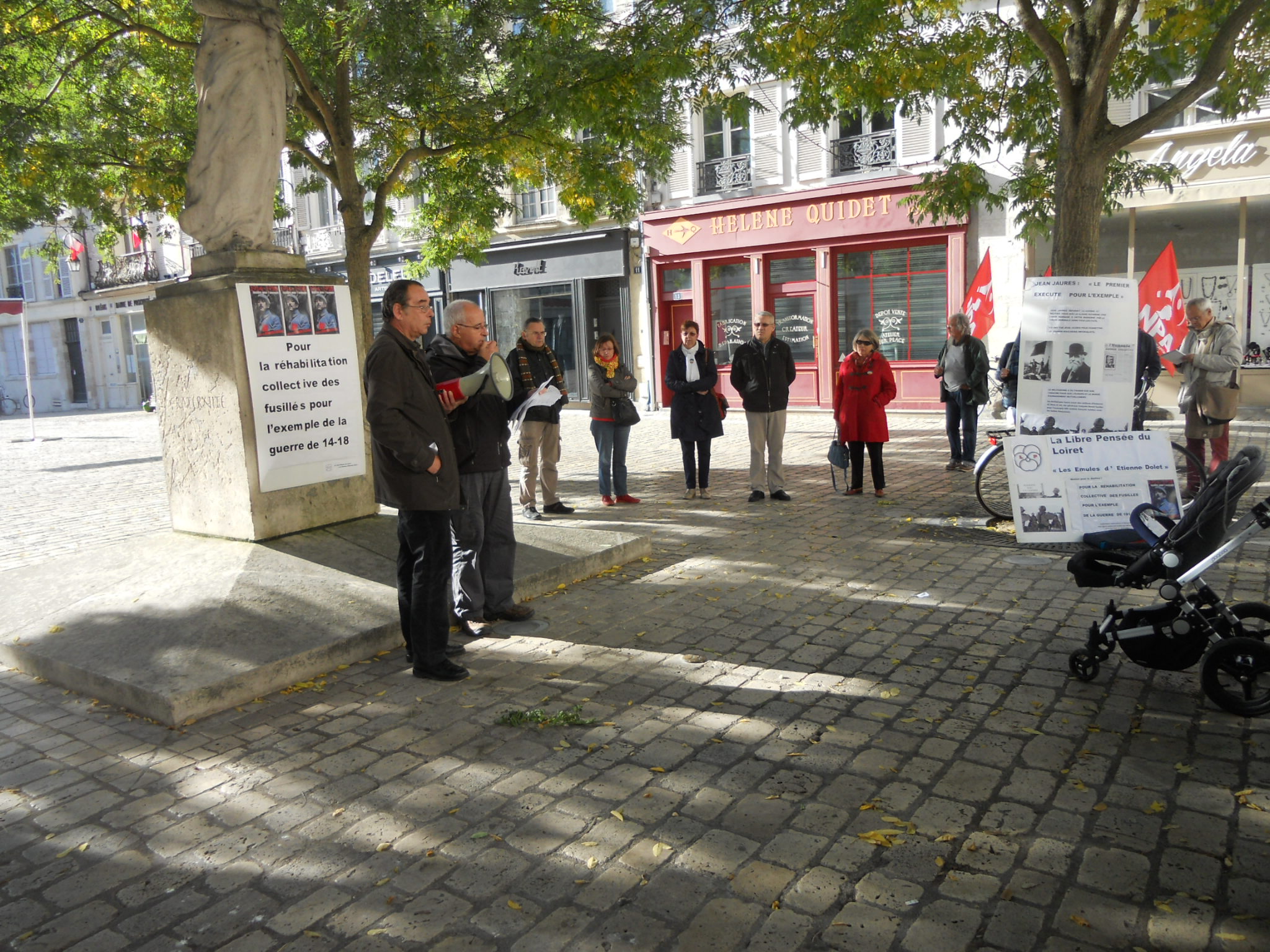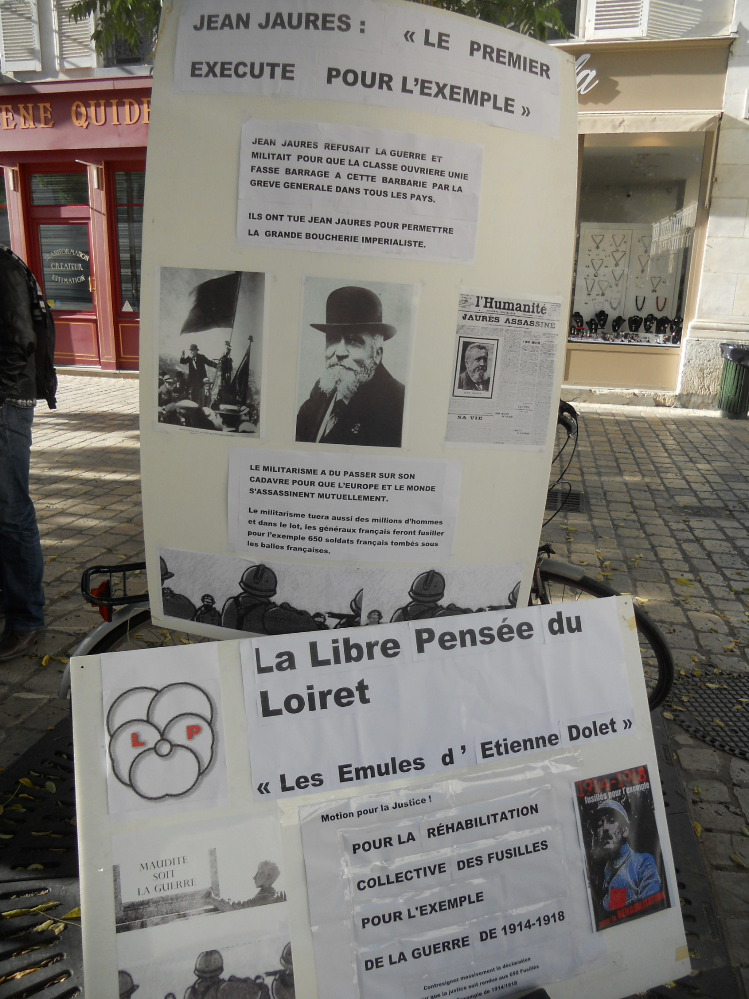 Pour la réhabilitation collective des fusillés pour l’exemple une trentaine de personnes se sont réunies mardi 11 novembre 2014 à 11h place de la République à ORLEANS à l’appel de la Libre Pensée, des Amis de l’Humanité, nu NPA, du PCF, du POI.