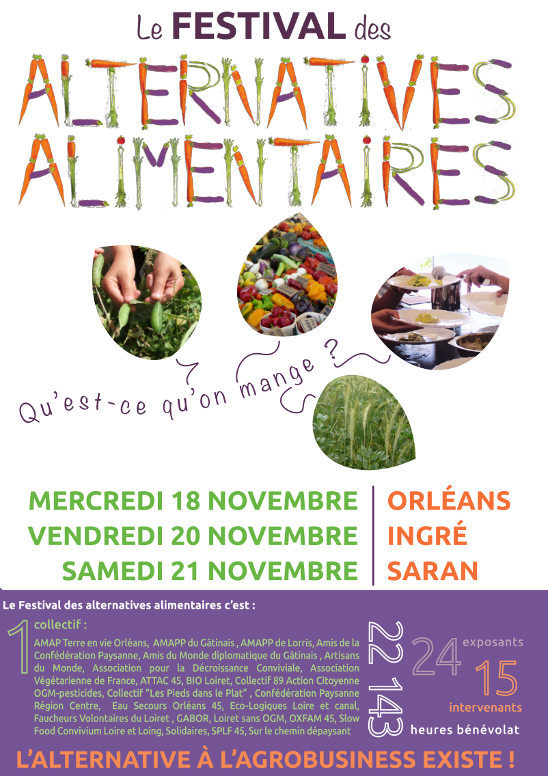 Festival des Alternatives Alimentaires, mercredi 18, vendredi 20 et samedi 21 novembre 2015 à Orléans, Ingré et Saran