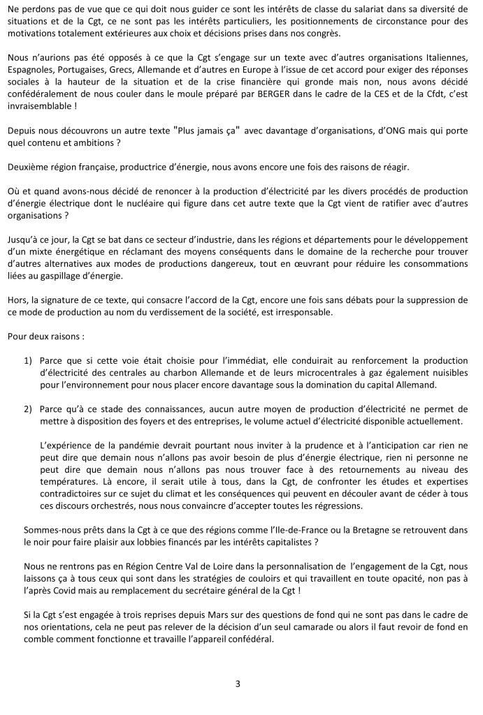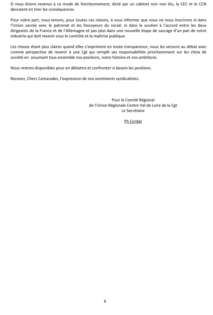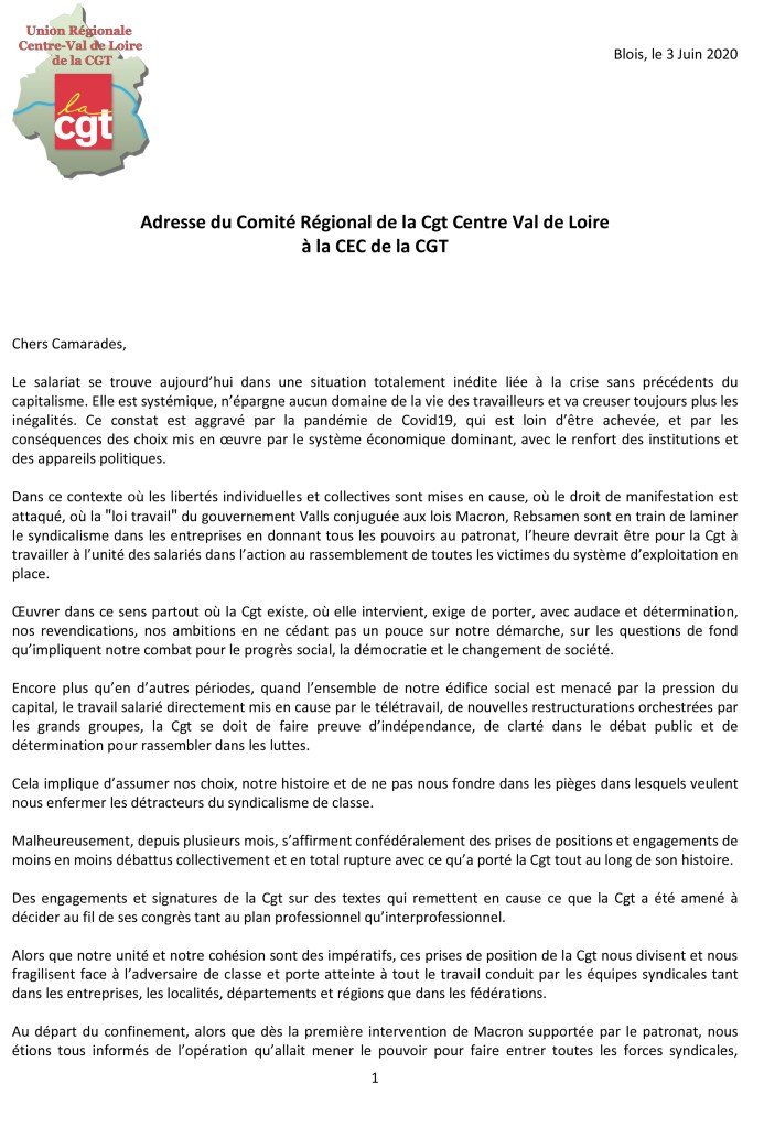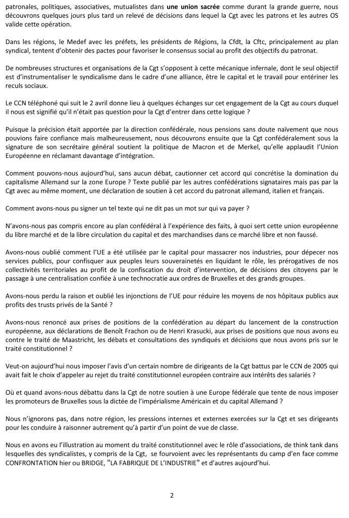Percutée par la volonté d’un certain nombre de responsables Confédéraux, autour de Philippe Martinez, qui souhaitent imiter l’attitude de la CFDT retrouver l’odeur de sainteté voulue par le MEDEF et le pouvoir ; une certaine base du syndicat et des structures un peu plus « luttes de classe » rejetent la politique des petits pas tant vis-à-vis de l’Europe que dans le cadre d’un « dialogue social » qui n’a servi qu’à duper les salariéEs