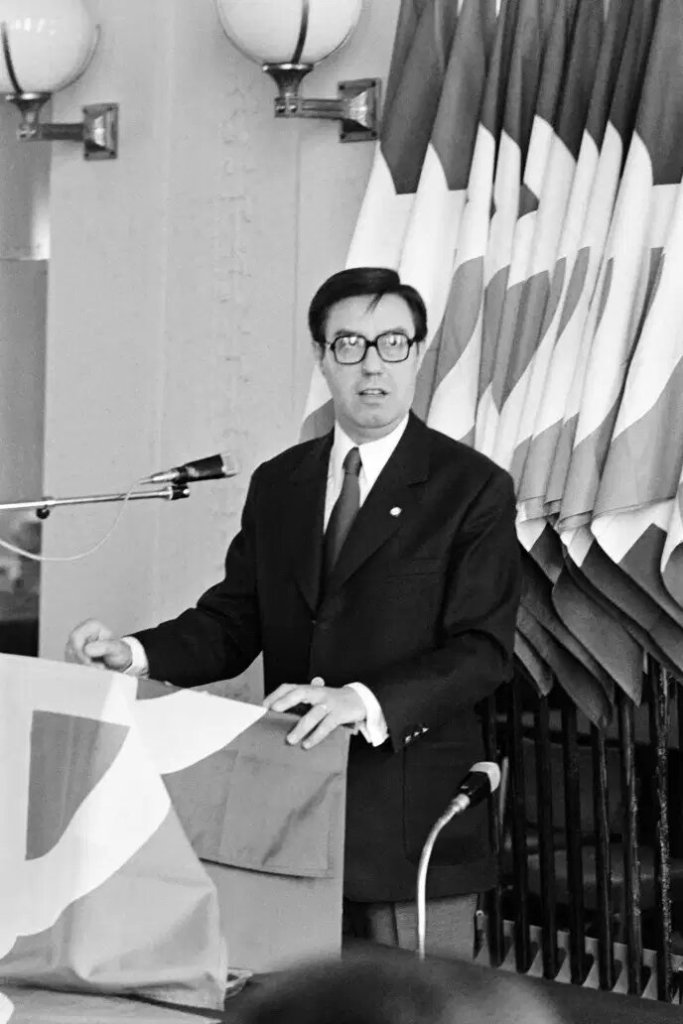 · · · · Pierre Sidos, président depuis 1968 du parti politique l’Œuvre française, prononce un discours, le 19 juin 1976, lors de l’ouverture du congrès de ce parti, à Paris. – / AFP