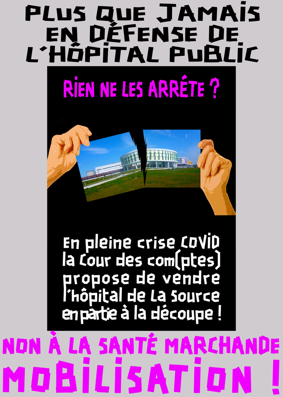 Alors merde au surdimensionnement supposé de l’hôpital d’Orléans et des hôpitaux publics, merde au tout privé, solution illusoire mais sonnante et trébuchante pour la classe dirigeante, merde aux larmes de crocodile de ceux qui œuvrent chaque jour pour détruire cet accès aux soins pour toutes et tous qu’ils exècrent. C’est maintenant que nous en avons besoin pour survivre et non du rapport des « confinéEs en Cours des Comptes » !