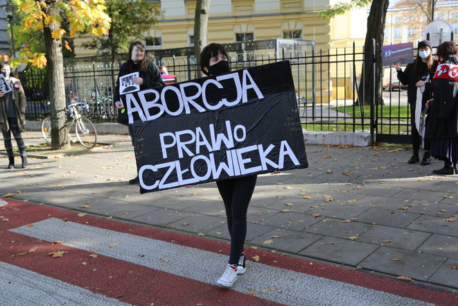 Une manifestante pro-avortement devant le tribunal constitutionnel à Varsovie. Sur la pancarte : « Avortement. droit de l’homme » © HB