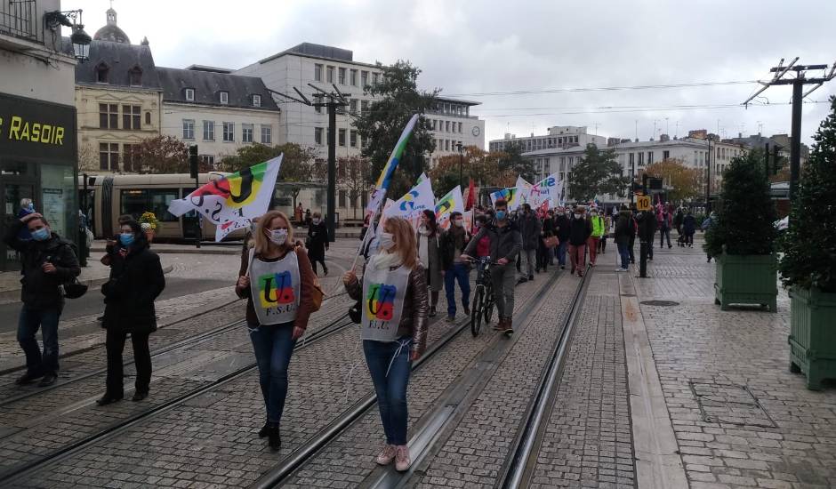 Environ 150 manifestants ont défilé dans le centre-ville d’Orléans ce 10 novembre, pour dénoncer le « protocole sanitaire renforcé » voulu par Jean-Michel Blanquer et qui a pris effet à la rentrée de novembre. Le ministre de l’Éducation nationale y est très clairement taxé de « démagogue » par les syndicats, du fait de l’application quasi impossible de ce protocole. « Nous avons vu, depuis le 2 novembre, plusieurs actions dans les établissements de l’agglomération orléanaise », explique Théo Roumier, secrétaire départementale de Sud Éducation Loiret. « Le taux d’occupation des seuls lycées va demeurer au-delà des 50% alors que nombre d’élèves sont asymptomatiques et que cette population n’est pratiquement pas testée. » Le militant syndical, par ailleurs enseignant au lycée professionnel Jean Lurçat de Fleury-les-Aubrais, assure que le gouvernement souhaite maintenir le présentiel en établissement coûte que coûte, quitte à « engorger les transports scolaires, les bus et les tramways ».