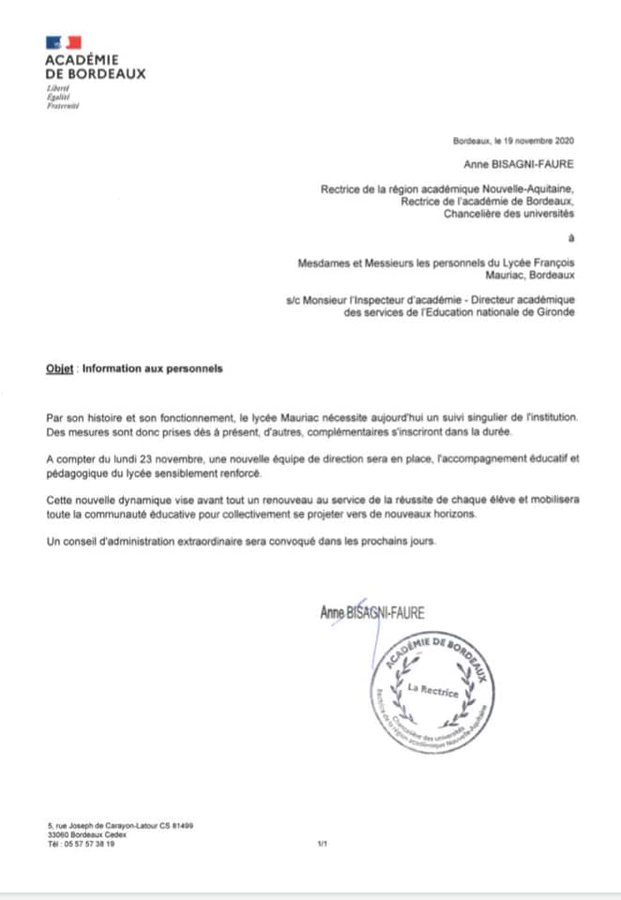 Comment le limogeage d’une direction et les mesures disciplinaires engagées arbitrairement contre trois de nos collègues pourraient-ils fédérer la communauté éducative du lycée François Mauriac et contribuer à la réussite de nos élèves dans un climat serein ?