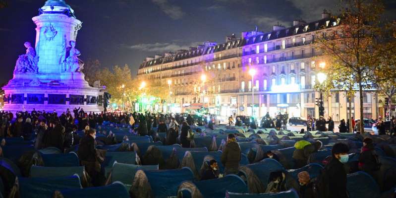 Des centaines de migrants se sont installés lundi soir place de la République parce qu’en plein froid et en pleine crise sanitaire ils et elles sont à la rue, harcelés constamment par la police sans aucune solution décente d’hébergement.
