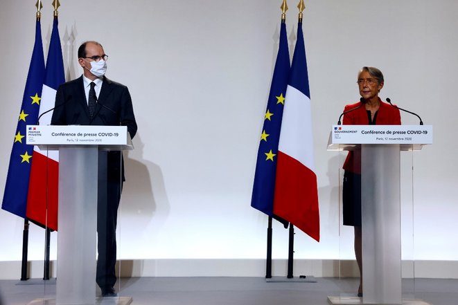 Le premier ministre Jean Castex et la ministre du travail Élisabeth Borne, le 12 novembre 2020. © Ludovic Marin / AFP
