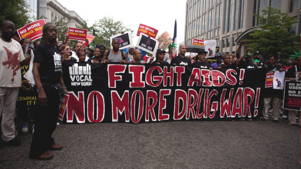 Ces programmes d’échange de seringues furent mis en place dans des villes à travers toute l’Amérique du Nord à la fin des années 80 par des militant·es combattant les ravages de l’épidémie de sida. Les usager·es d’héroïne de la fin des années 80—début des années 90 mouraient à un rythme effroyable. Des seringues propres sauvaient les vies de manière bien plus efficace que n’importe quel autre type d’intervention. Beaucoup de premiers programmes de ce genre aux États-Unis étaient clandestins. Les bénévoles risquaient la prison ou l’interdiction d’exercer la médecine. Les usager·es d’héroïne politisé·es par le mouvement contre le sida s’occupaient elles et eux-mêmes des programmes d’échange, côte à côte avec des infirmier·es et des médecins, des anarchistes et d’autres militant·es préoccupé·es par les divisions de classe et de race au sein même du mouvement de lutte contre le sida. Pour les anarchistes, ces programmes représentaient une forme d’entraide radicale sans le moralisme et la condescendance propres à la plupart des services sociaux. Les groupes militant contre le sida luttaient pour des échanges de seringues, aussi bien que pour le relogement des personnes à la rue, contre les violences policières et la criminalisation du sida, et pour les droits des travailleur·ses du sexe. Le mouvement contre le sida se révéla cependant largement incapable de construire des liens forts avec un mouvement ouvrier désormais affaibli et les organisations antiracistes pour les droits civiques. Des décennies de crise économique et de criminalisation, ainsi que la faillite politique de la gauche, avaient effectivement brisé toute forme de solidarité entre les salarié·es et les sous-prolétaires racisé·es.