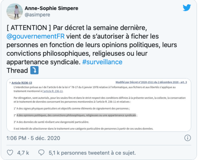Au Journal Officiel du vendredi 4 décembre 2020, dans l’indifférence générale, trois décrets du ministère de l’Intérieur ont été publiés. Trois décrets imposés sans débat, qui aggravent considérablement les capacités de fichage de la population, et en particulier des opposants, par la police .