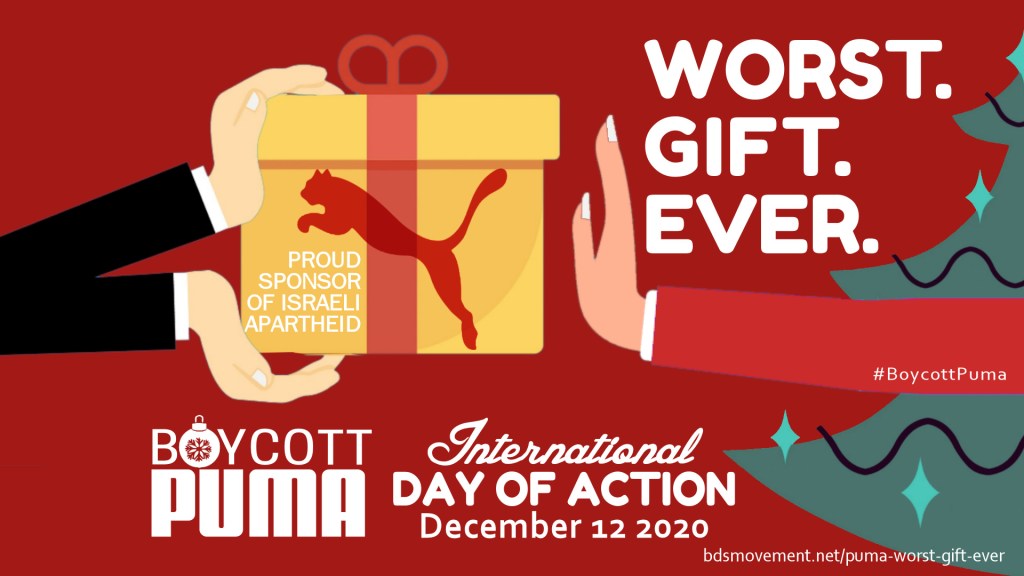Le soutien de Puma à l’occupation militaire d’Israël et au régime d’apartheid en fait… Pire. Cadeau. Jamais. Joignez-vous à des groupes à travers le monde pour la quatrième journée d’action pour protester contre le soutien de Puma aux colonies illégales d’Israël sur les terres palestiniennes volées, le 12 décembre.