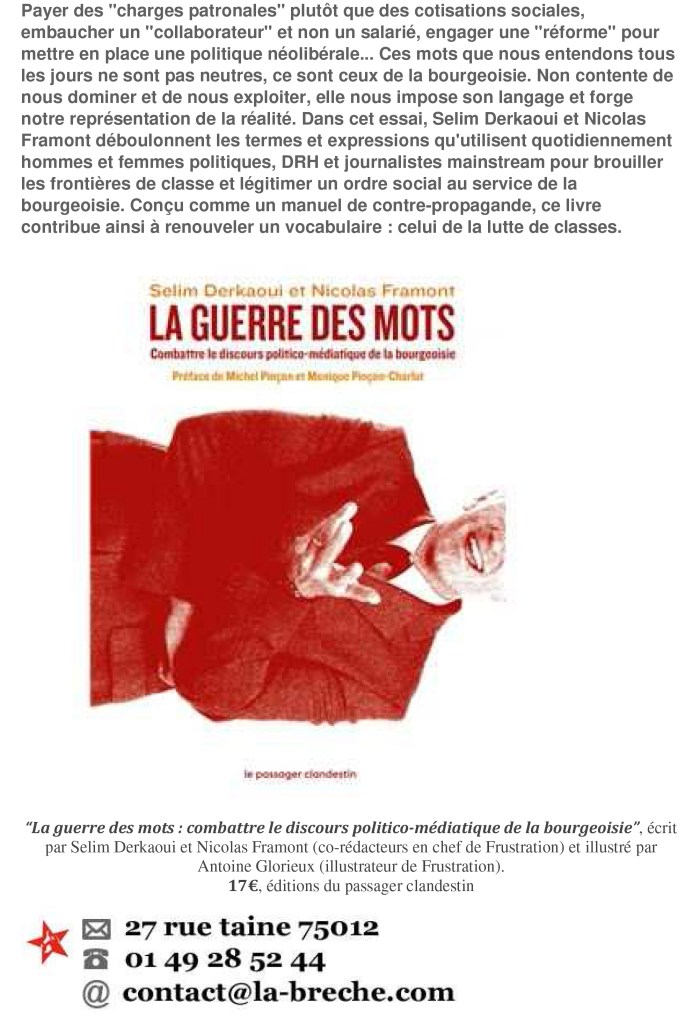 Ce texte est extrait du livre “La guerre des mots : combattre le discours politico-médiatique de la bourgeoisie”, écrit par Selim Derkaoui et Nicolas Framont (co-rédacteurs en chef de Frustration) et illustré par Antoine Glorieux (illustrateur de Frustration).