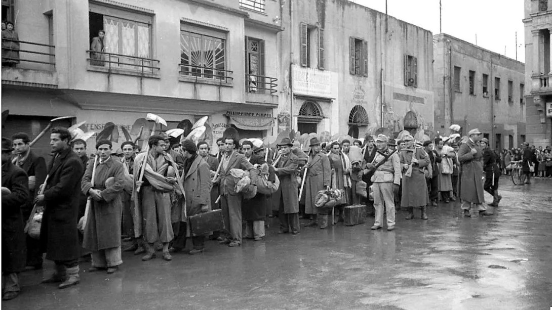Des hommes juifs de Tunis, réquisitionnés pour le travail forcé, en route pour le camp de Bizerte, décembre 1942