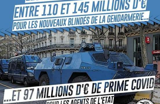 Alors que les hôpitaux ferment des lits, que les personnels/les de santé sont sous payéEs et quittent l’hôpital épuiséEs, l’État policier s’offre des blindés pour mater les manifestantEs..la royauté française sur le déclin !