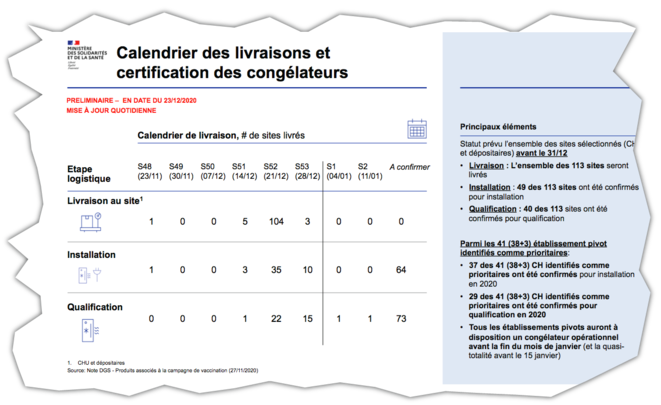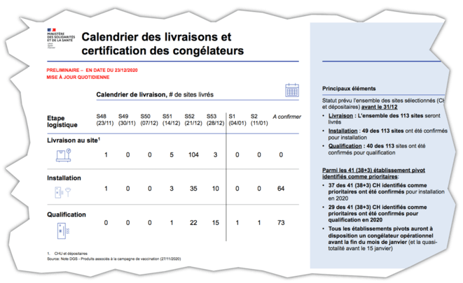 Selon le document du 23 décembre, la livraison des 100 établissements choisis pour recevoir les super-congélateurs à – 70 ° n’a commencé que dans la semaine du 21 décembre. Lors d’une conférence de presse de la Fédération hospitalière de France (FHF), mardi 5 janvier, son directeur de l’offre de soins, Alexandre Mokede, a expliqué que seuls « la moitié des établissements supports ont été livrés en congélateurs » et que « tous devraient l’être d’ici la mi-janvier » seulement.