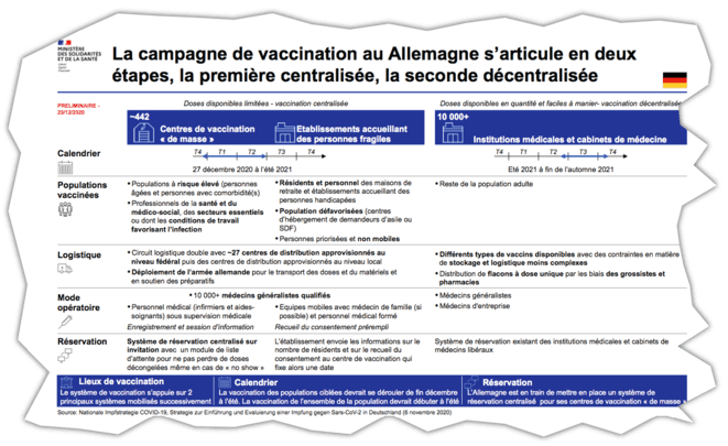 Or, le 23 décembre, il était clair que les Allemands seraient bien plus performants. La première étape allemande a débuté dès le 27 décembre et vise un public très large : toutes les personnes à risque élevé, qu’elles soient âgées ou atteintes d’autres maladies, tous les professionnels de santé et du médico-social, les résidents des maisons de retraite et les populations défavorisées. Pour y parvenir, des équipes mobiles se déplacent dans les maisons de retraites, et des centres de vaccination « de masse » sont ouverts. L’armée allemande a même été mobilisée en soutien du dispositif.