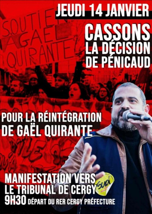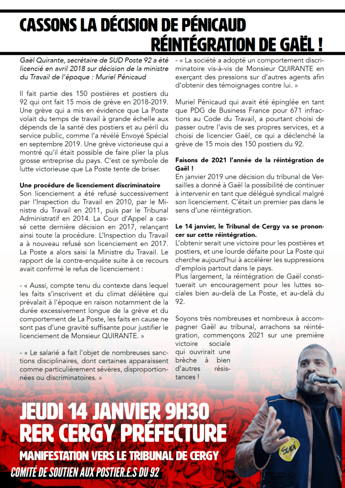 Le licenciement scandaleux de Gaël Quirante par La Poste, autorisé par l’ex-ministre du travail Muriel Pénicaud veut servir d’exemple contre les militants et les travailleurs combatifs. Soyons nombreux pour exiger la réintégration de notre camarade le jeudi 14 janvier au tribunal administratif de Cergy !