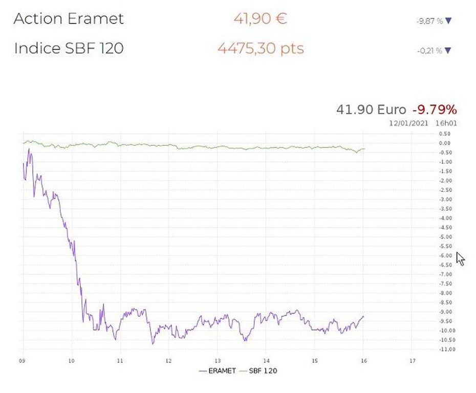 Chute du titre ERAMET à la Bourse de Paris le 12/01/2021 à 15:20 GMT • ©Groupe Eramet