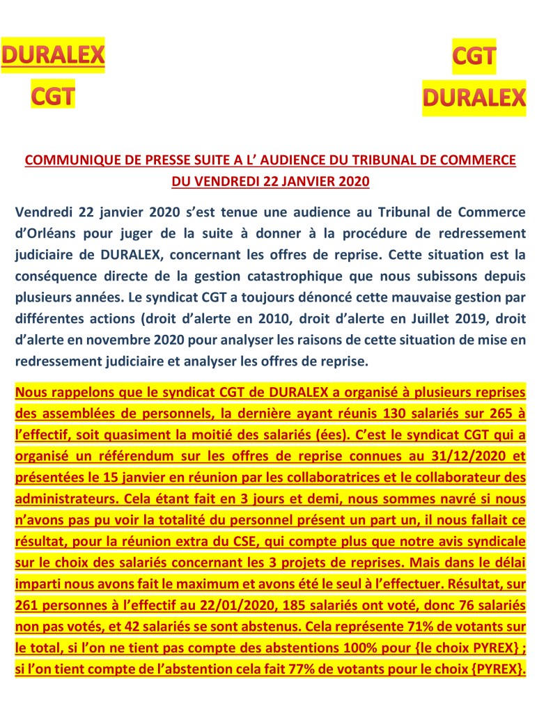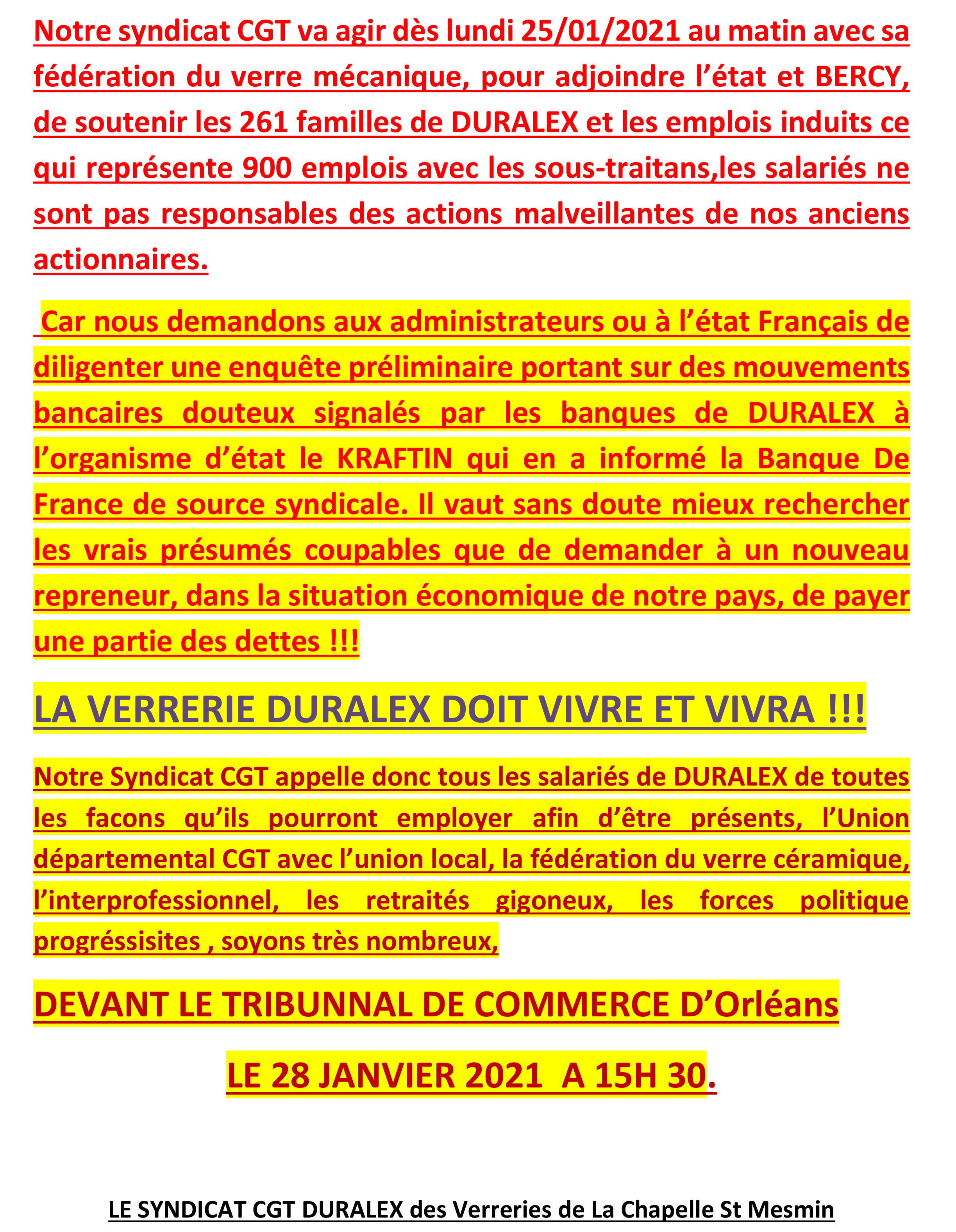 Les salariés de Duralex luttent pour la reprise du site de la Chapelle St Mesmin pour le maintien de tous les emplois un Rassemblement est organisé le jeudi 28 janvier à 15h30 devant le Tribunal de commerce rue de la Bretonnerie Orléans