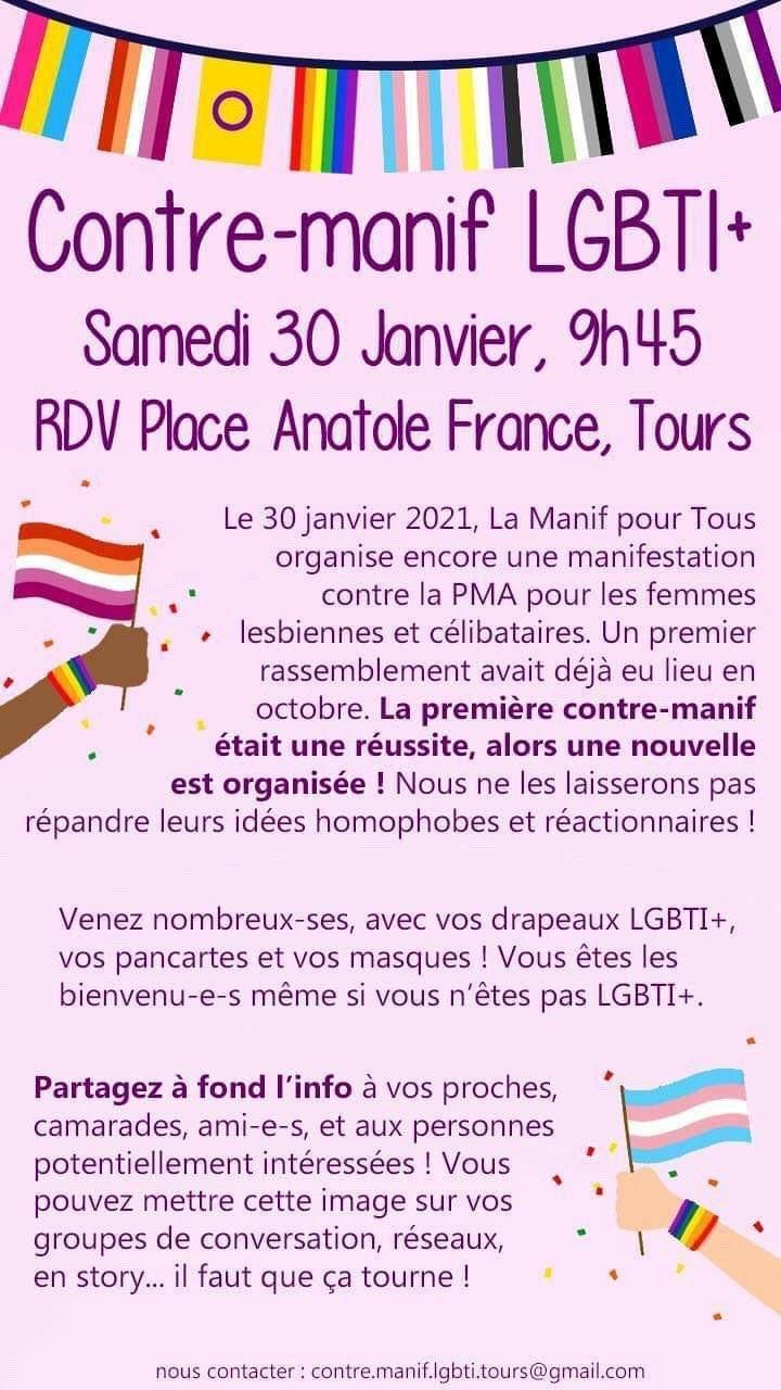 Le 30 janvier, à Tours comme partout en France, « La Manif Pour Tous » et « Marchons Enfants » initie à nouveau à une mobilisation nationale contre la PMA avec des relents ouvertement homophobes et anti IVG. Cette 2ème mobilisation anti PMA s’inscrit dans une montée de l’extrême droite qui multiplie les coups d’éclats, symboliques comme la nouvelle opération de Génération Identitaire aux frontières (dans les Pyrénées cette fois) ou carrément violentes avec la multiplication des agressions physiques et des attaques de lieux militants partout en France, dernièrement à Angers où le groupe informel néonazi Ouest Casual a ravagé le lieu autogéré l’Etincelle avec un autodafé de centaines de livres et d’affiches/autocollants. Le compte rendu de cette attaque sur le fil Telegram de Ouest Casual est illustré d’une photo multipliant les références au IIIè Reich : salut nazi, tête cachée par des Totenkopf SS (symbole de la Waffen SS), etc. À Tours, le 5 octobre dernier, le drapeau LGBTI+ posé sur la mairie a été arraché et détruit par des néofascistes qui — comme à Angers — courent toujours…