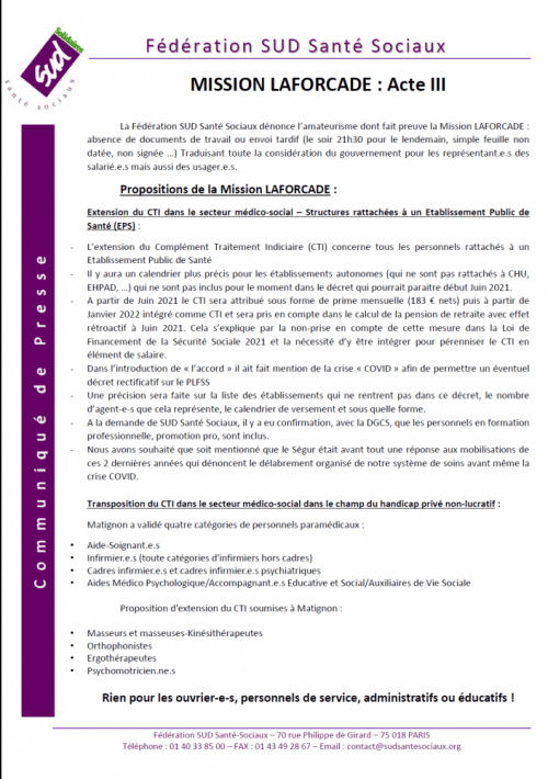La colère de ces invisibles, ces exclu-e-s, ces sacrifié-e-s du Ségur, se regroupant notamment dans un collectif unitaire “183 euros pour tous et toutes” dénonçant cette injustice, ce marché de dupes, a obligé le gouvernement à mettre en place dans la précipitation, fin décembre la Mission Laforcade.