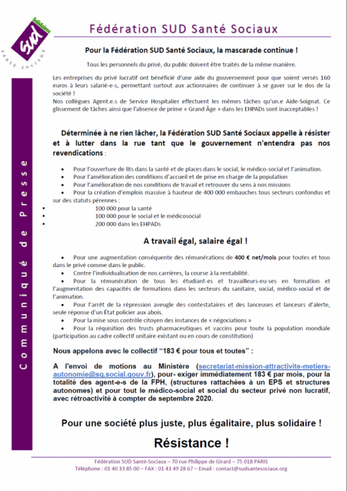 Nous ne sommes pas dupes de leur stratégie de destruction de nos métiers. Puisque les 183 € ont été octroyés à certains, la Fédération SUD Santé Sociaux exige son octroi à tous les personnels de notre secteur, sans aucune discrimination.