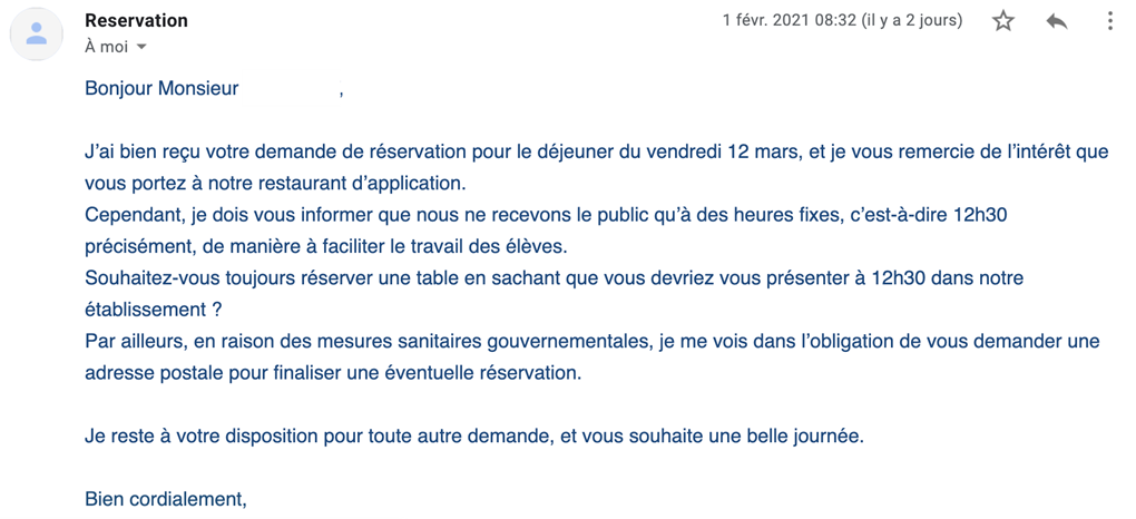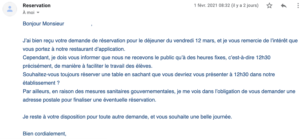 Nous avons aussi pu très facilement réserver par mail lundi, une table de quatre personnes le 12 mars prochain avec pour seule condition de laisser une adresse postale et de venir à 12 h 30.