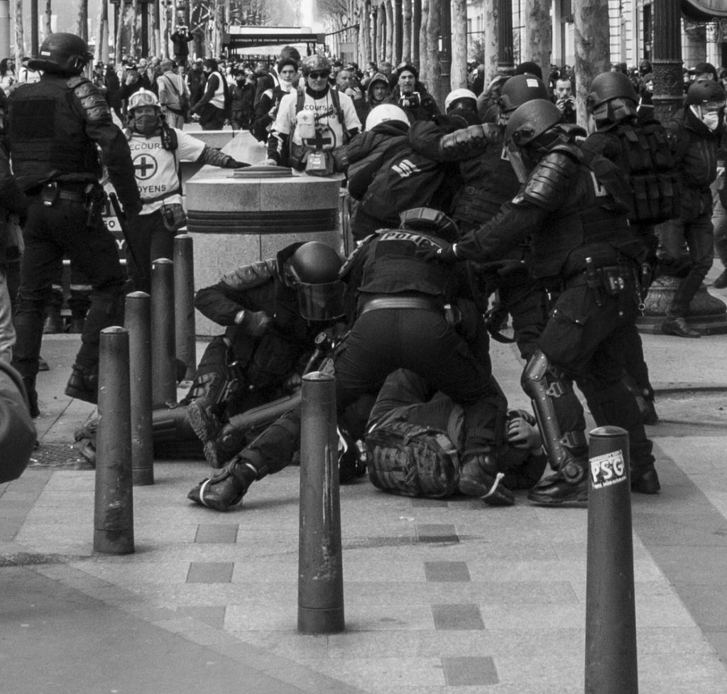 On voit la généralisation du port d’un certain nombre d’outils qui protègent la santé comme les foulards, les lunettes et masques de ski, les casques, protège-tibia, les banderoles renforcées. Toutes ces choses-là ont pour objectif de protéger les manifestants et de leur permettre malgré le recours aux armes et donc à la violence policière, de manifester et de s’exprimer. La question des armes est ainsi un problème démocratique puisqu’elles viennent restreindre très fortement le droit à la libre expression. L’autodéfense populaire n’est pas forcément quelque chose de très réfléchi et préparé, et peut se transmettre spontanément dans le cadre d’une manifestation. On a pu l’observer avec le mouvement des Gilets jaunes, dont je cite des exemples dans le livre, de cas où des manifestants ont appris sur le champ, la nécessité de se protéger des risques.
