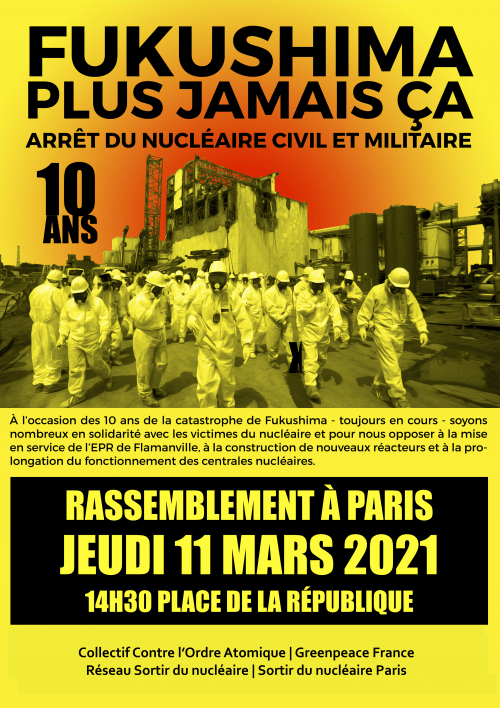 Le Collectif contre l’ordre atomique (membre d’Arrêt du nucléaire) appelle à participer au rassemblement organisé ce jeudi 11 mars de 14h30 à 17h sur la place de la République. Notre mot d’ordre : Arrêt du nucléaire avant la catastrophe et solidarité avec les victimes de cette industrie mortifère !
