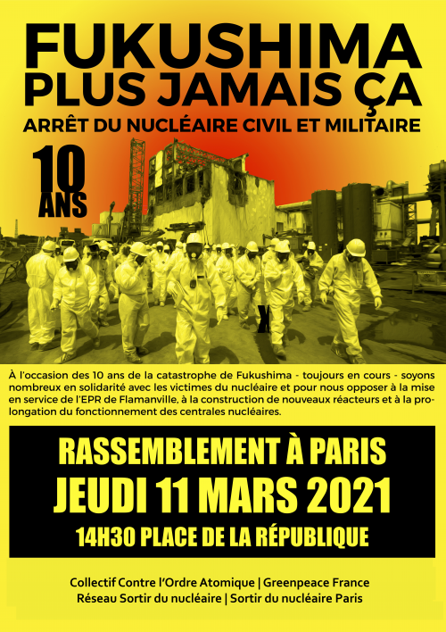 Le Collectif contre l’ordre atomique (membre d’Arrêt du nucléaire) appelle à participer au rassemblement organisé ce jeudi 11 mars de 14h30 à 17h sur la place de la République. Notre mot d’ordre : Arrêt du nucléaire avant la catastrophe et solidarité avec les victimes de cette industrie mortifère !