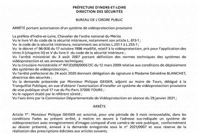Pas de nouvelle caméra donc, mais une caméra que l’on peut installer temporairement dans de nouveaux endroits… La nuance permet sans doute à l’adjoint écolo-sécuritaire de se sentir droit dans ses bottes alors qu’il recycle sans vergogne l’arsenal acquis par la municipalité précédente [2]. L’arrêté préfectoral autorisant l’installation de cette caméra précise bien qu’il s’agit d’un système « provisoire » ; l’autorisation vaut pour une période de trois mois renouvelable, contre cinq ans habituellement.
