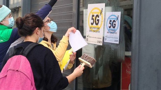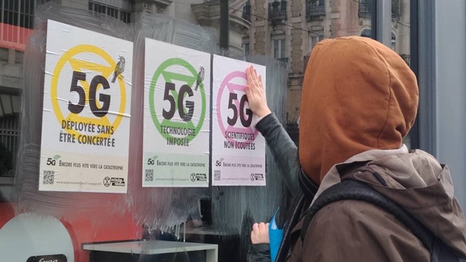 Le collectif environnementaliste Extinction rébellion a placardé des affiches dénonçant la 5G sur les vitrines de trois opérateurs de téléphonie, ce dimanche 14 mars, à Orléans.