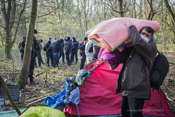Photo de une : évacuation d’un campement sommaire installé dans le bois de Puythouck, à Grande-Synthe, février 2021 © Pedro Brito Da Fonseca / Basta !