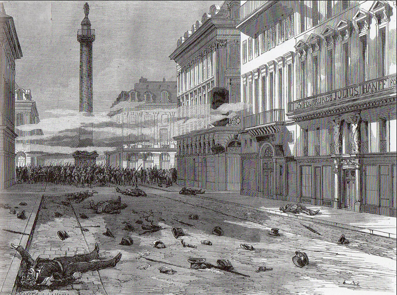 Rue Neuve-Saint-Augustin. — Mon bataillon est à l’État major de la place de Paris, place Vendôme depuis le 18 mars, quatre jours. Nous étions deux, détachés en sentinelles avancées au coin de la rue de la Paix et de la rue Neuve-Saint-Augustin. Et voilà tous ces messieurs qui arrivent en hurlant, « Vive l’ordre », qu’ils criaient, et ils nous sautent dessus en nous traitant d’assassins. Ils nous prennent nos chassepots et nous déshabillent. Regardez dans quel état est mon uniforme! En lambeaux! Nous avons réussi à nous dégager et à retourner nous mettre à l’abri avec nos camarades. Ceux de l’ordre, ils devaient être dans les cinq cents, continuaient à avancer dans le désordre, avec leurs rubans bleus et leurs cannes-épées. Je ne voyais plus ce qui se passait, il y a eu des sommations, puis nos camarades ont tiré une salve. Alors là, ils ont déguerpi vite fait les beaux messieurs, la rue a été vide en un clin d’œil, sauf les revolvers abandonnés et un ou deux morts. Mais ils l’avaient cherché! [ma]