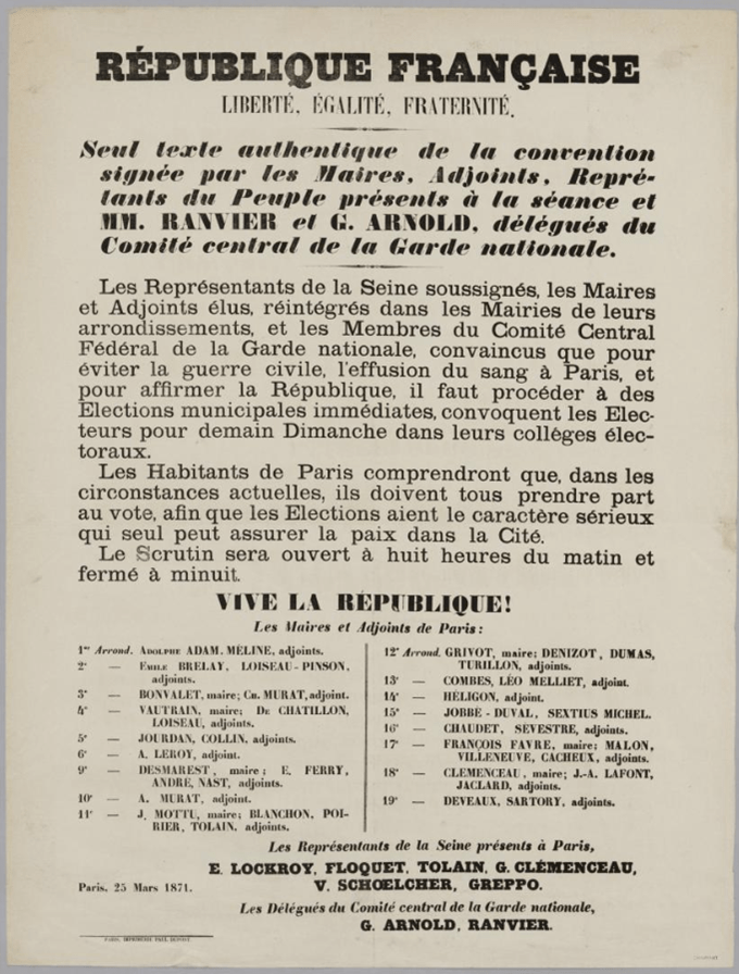 Le Comité Central de la Garde nationale auquel se sont ralliés les députés de Paris les maires et les adjoints convaincu que le seul moyen d’éviter la Guerre civile, l’effusion de sang à Paris, et en même temps d’affermir la république est de procéder à des élections immédiates convoque pour demain dimanche tous les citoyens dans les Collèges électoraux.