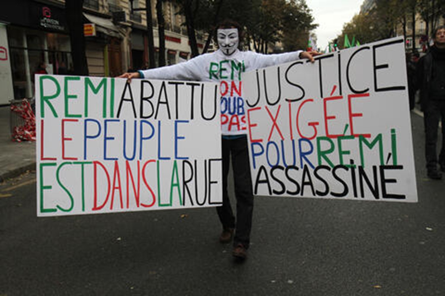Rémi Fraisse, tué par une grenade offensive tirée par un gendarme la nuit du 25 au 26 octobre en 2014 à Sivens, où se tenait un rassemblement d’opposants au projet de construction d’un barrage sur un affluent du Tarn. C’était jour pour jour 2 mois après le meurtre de Hocine Bouras à Colmar, tué d’une balle dans la tête par un gendarme alors qu’il était menotté, et en situation de transfert.