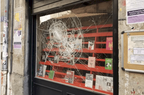 Cette fois-ci, c’est à coups de pavés que les nazillons ont brisé la porte d’entrée et les vitrines ; certains ont tenté d’entrer pour agresser physiquement les 8 personnes présentes à l’intérieur. Heureusement, il n’y pas eu de blessé.es et les voisin.es ont grandement participé à ce que l’attaque ne dure pas plus longtemps. Cette attaque a été à l’image de l’extrême-droite lyonnaise : sournoise et violente.