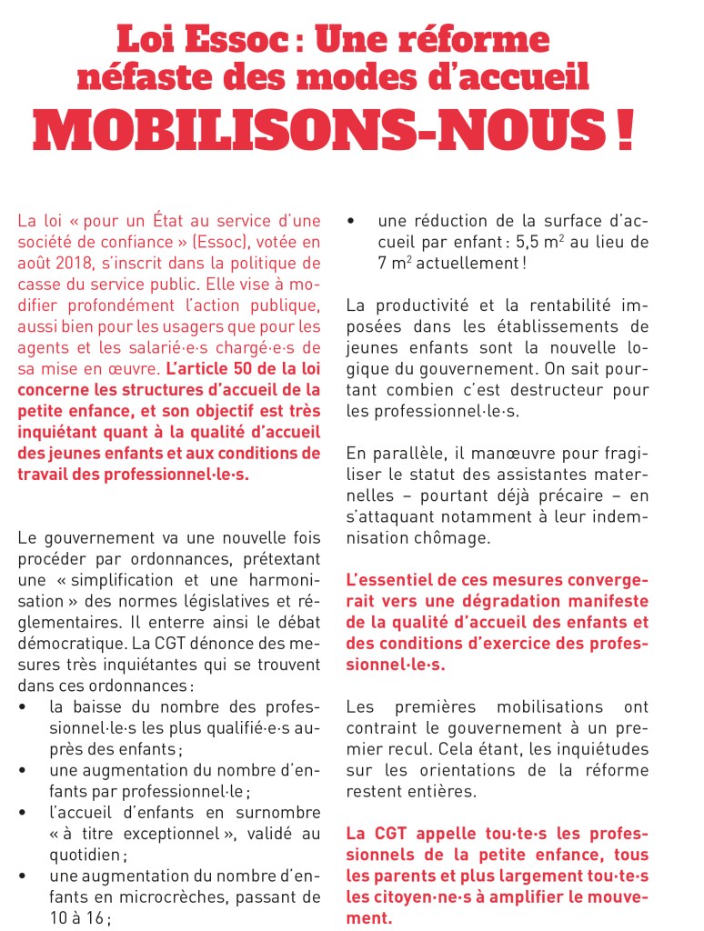 La Loi ESSOC, de son nom « pour un Etat au Service d’une Société de Confiance », s’inscrit dans la politique de casse du service public. Elle vise à modifier profondément l’action publique aussi bien pour les usagers, que pour les agent·e·s chargé·e·s de sa mise en ouvre. Son article 50, concerne les structures d’accueil petite enfance. Des ordonnances devraient être publiées avant l’été. Leur contenu est très inquiétant quant à la qualité et aux conditions d’accueil des jeunes enfants. Les conditions de travail des professionnels de la petite enfance en seront directement impactées.