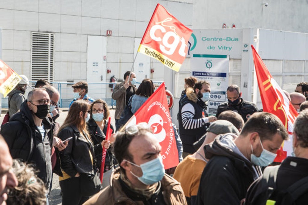 Rassemblement de salariés de la RATP en soutien à un élu syndical menacé de licenciement, à Vitry-sur-Seine (Val-de-Marne), vendredi 2 avril 2021. CAMILLE MILLERAND / © CAMILLE MILLERAND / DIVERGENCE POUR LE MONDE