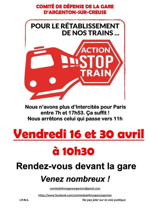 Vendredi 16 avril, vers 11h, le Comité de Défense de la Gare SNCF d’Argenton-sur-Creuse reprendra ses “Actions Stop train” pour obtenir le rétablissement d’une meilleure desserte de la gare. “ On arrête le train qui passe dans notre gare vers 11h. Nous voulons qu’il desserve Argenton, tant que l’Intercités de 10h n’est pas rétabli. Nous renouvellerons cette action le vendredi 30 avril si la SNCF ne bouge pas . Venez nombreux ! N’oubliez pas de porter votre masque dans le respect des règles sanitaires actuelles“, déclarent les responsables de l’association, présidée par Martine Irzenski.