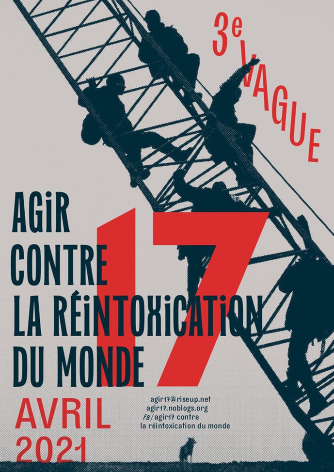 Nous appelons donc une nouvelle fois les habitant.es des villes et des campagnes à informer et accentuer localement la pression sur les secteurs qui leur semblent le plus évidemment empoisonnants et dispensables : cimenteries, usines de pesticides ou productions de gaz et grenades de la police, industrie aéronautique, publicitaire ou construction de plates-formes Amazon, unités d’élevage industriel, développements de l’industrie nucléaire, clusters développant le monde « sans contact »… Nous appelons en ce sens le 17 avril à une troisième série d’actions, blocages, rassemblements et occupations contre de tels lieux de production, chantiers et infrastructures.
