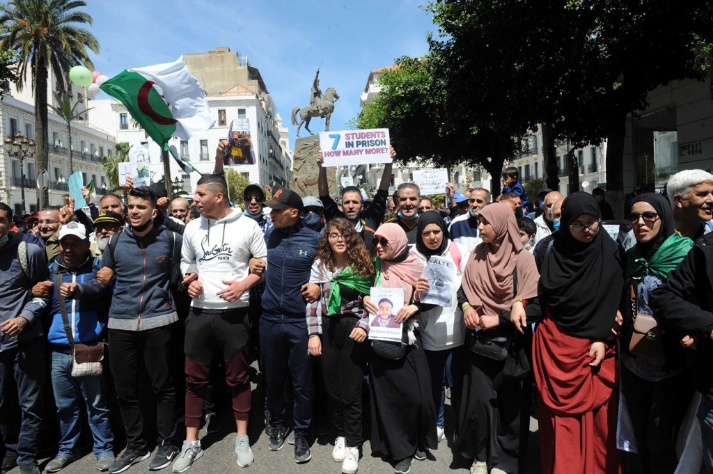 La foule martèle : «Harrirou el massadjine ma baouche el cocaïne» (Libérez les détenus, ce ne sont pas des vendeurs de cocaïne), «Djazair horra dimocratia» (Algérie libre et démocratique), «Sahafa horra, adala moustaqilla» (Presse libre, justice indépendante)…