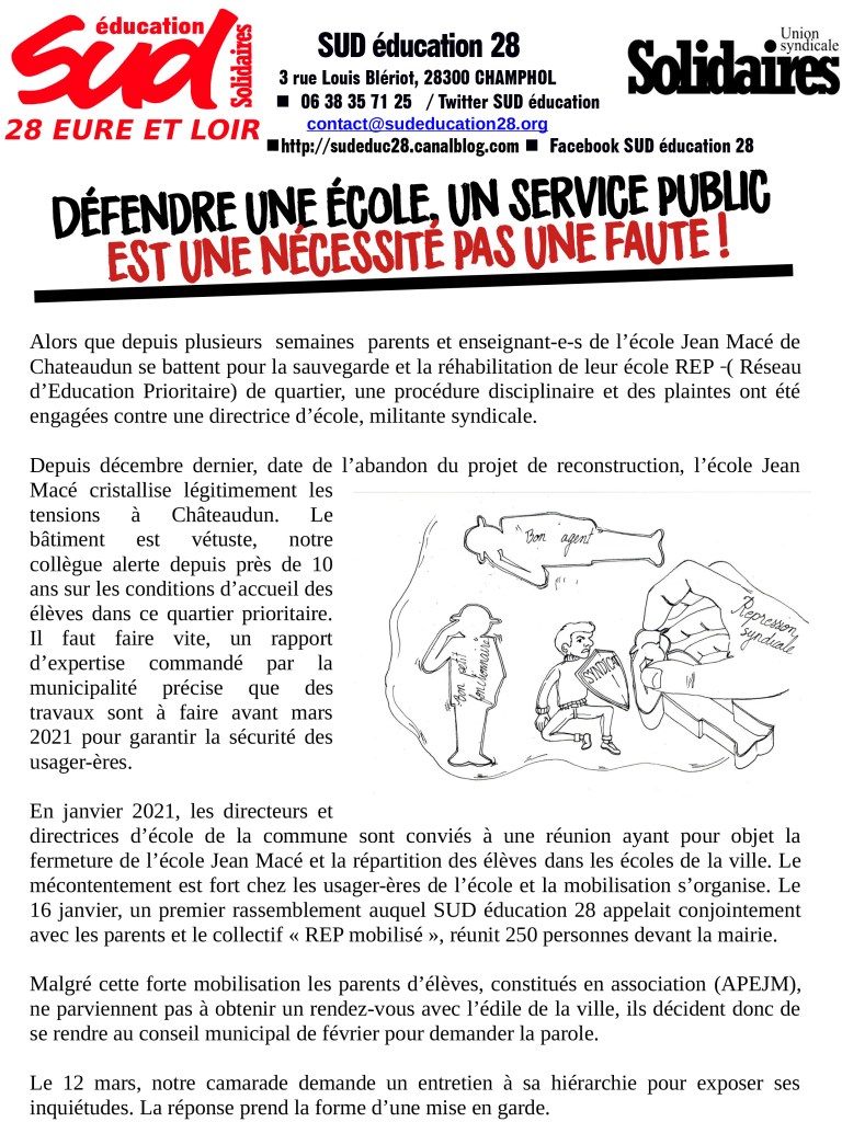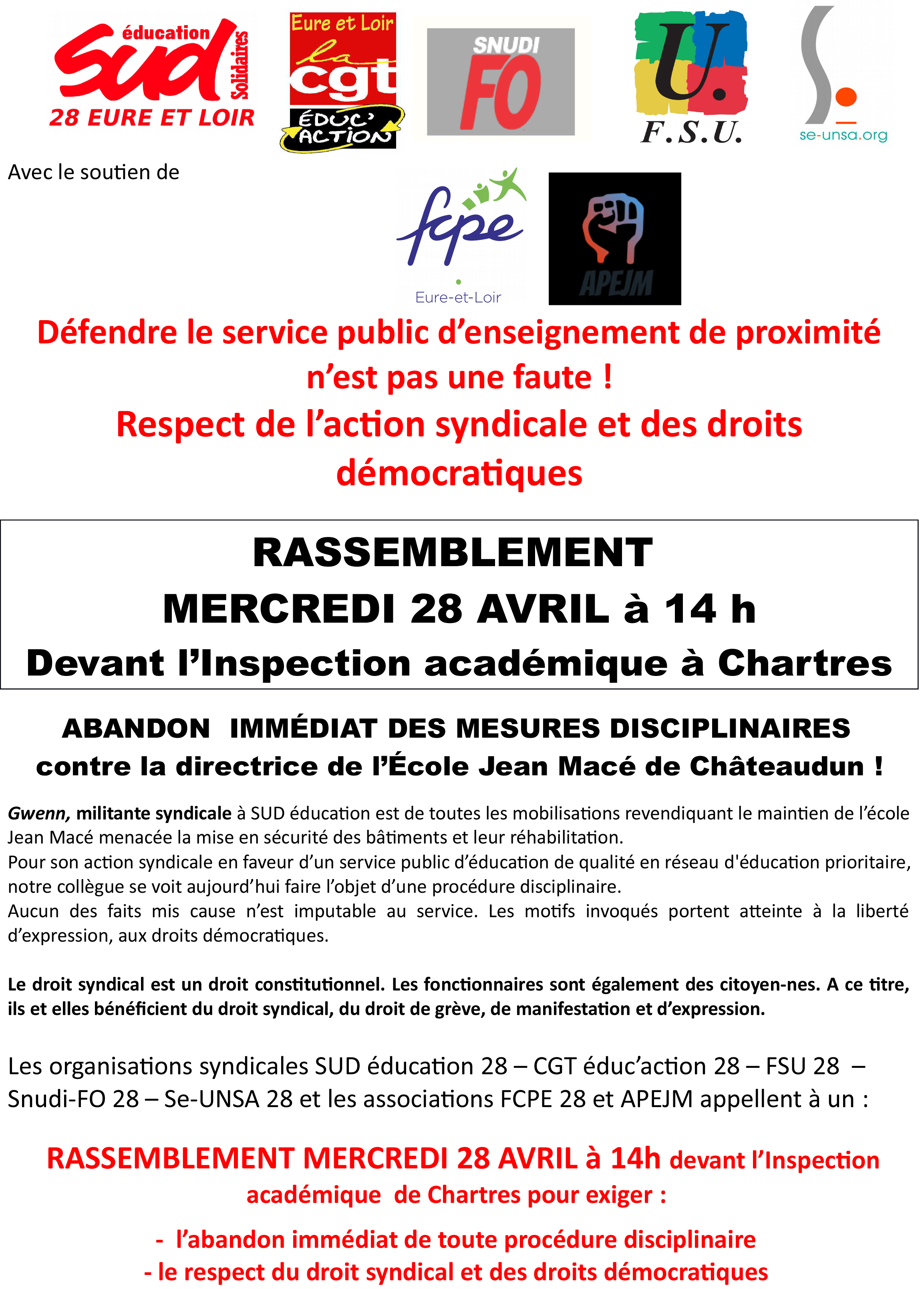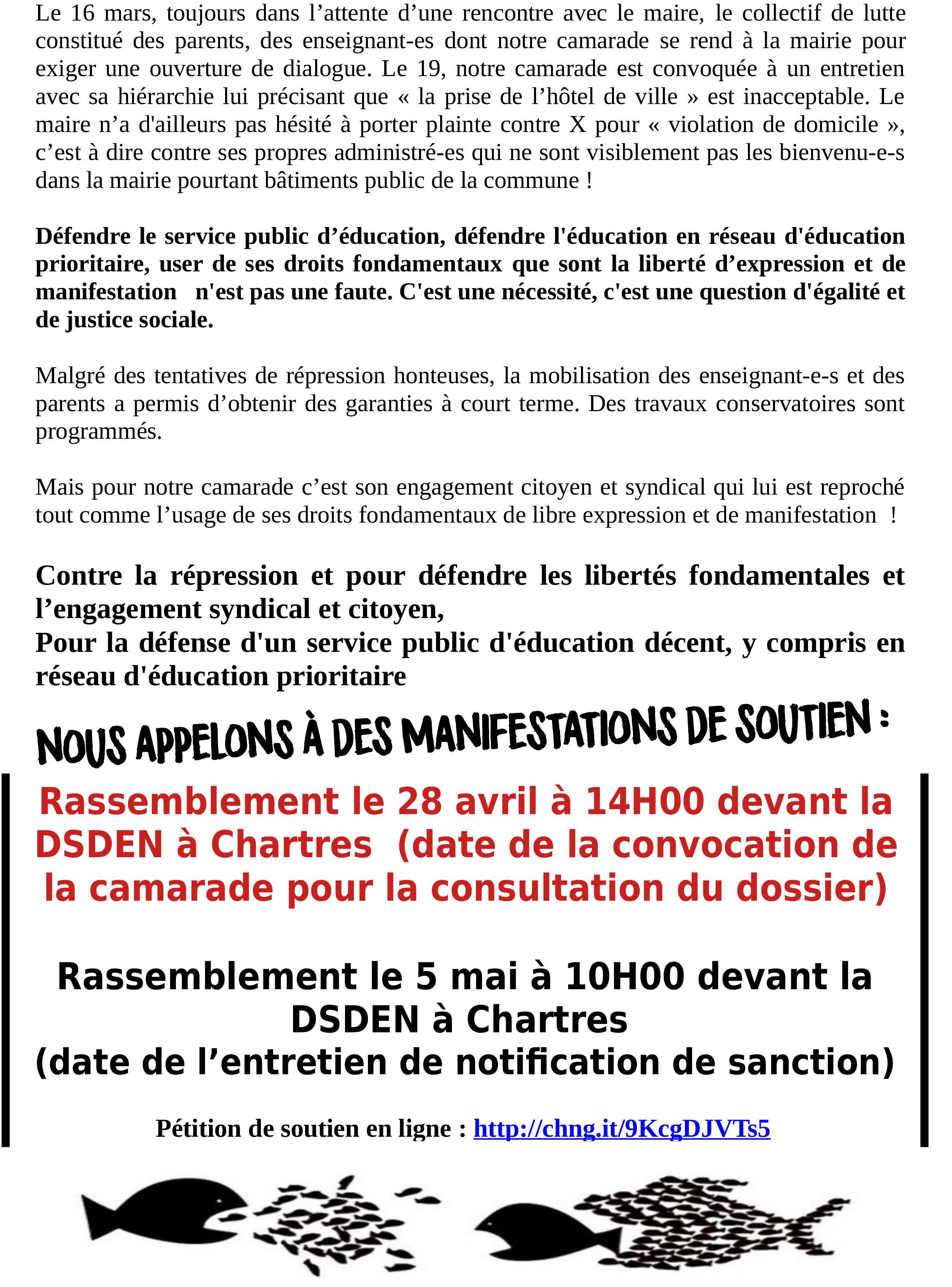 > Pour dénoncer cette répression et ces intimidations SUD éducation 28 soutenue par une large intersyndicale et des associations de parents d’élèves appellent à une manifestation / rassemblement. (Tract au-dessous)