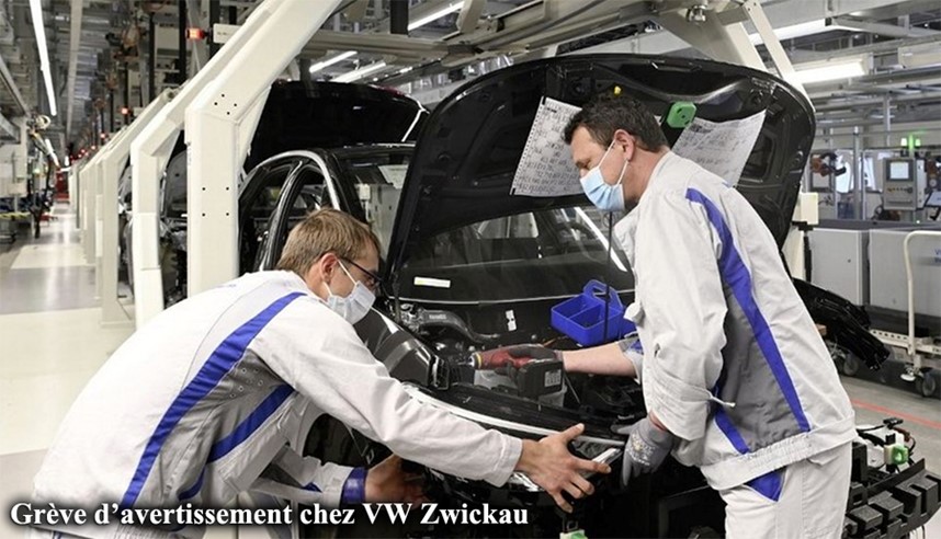 L’hebdomadaire Automobilwoche du 28 avril 2021 écrit: «À Leipzig et à Zwickau, plus de 14 000 travailleurs de l’industrie métallurgique et électrique de Saxe sont de nouveau en grève mercredi 28 avril pour faire valoir leur revendication d’égalité salariale en Allemagne de l’Est et de l’Ouest. Dans l’usine Porsche de Leipzig, ainsi que chez Volkswagen et les fournisseurs GKN Driveline Mosel et SAS Automotive Systems à Zwickau et Meerane (district de Zwickau), les chaînes de montage seront donc à nouveau à l’arrêt – cette fois pendant 24 heures. «Des grèves plus longues augmentent l’intensité de notre pression sur les employeurs», déclare Bernd Kruppa, premier représentant officiel d’IG Metall Leipzig. «Les solutions pour les employés doivent être trouvées à la table des négociations.» La vague de grèves d’avertissement dure depuis le début du mois de mars. Le syndicat veut ainsi faire pression sur le conflit salarial actuel. Mardi 27 avril déjà, plus de 5000 employés de l’usine BMW de Leipzig avaient cessé de travailler pendant 24 heures.»